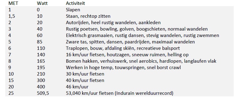 1 MET (metabole equivalent) is 1x het rustmetabolisme. Dit is 3,5 x het lichaamsgewicht (bv 3,5 x 75 kg = 262,5 ml/min.kg). Door de zuurstof opname op het omslagpunt door de MET te delen krijg je het MET getal. Dit maakt het makkelijk om de prestatie bij activiteiten van het dagelijks leven en werk te voorspellen.