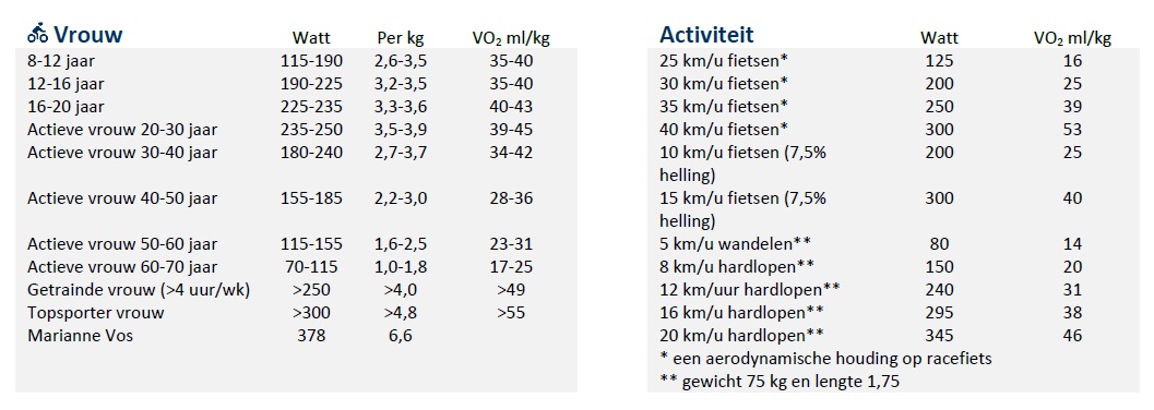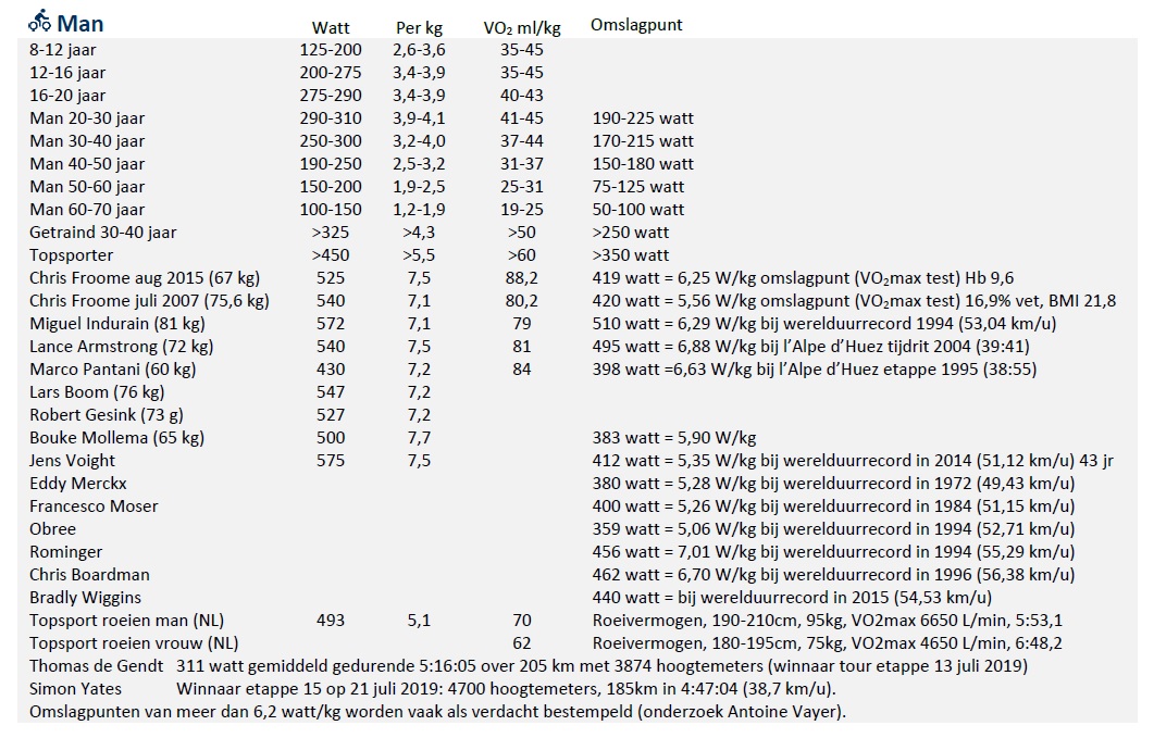 Dit is het maximaal wattage tijdens een fietstest (en snelheid tijdens een loopbandtest). Je maximaal vermogen is niet je duurvermogen, je kan het immers niet lang volhouden. Het geeft wel aan wat het potentieel is voor het komende seizoen. Met goede training is het mogelijk om je omslagpunt te verplaatsen naar 80-85% van dit maximaal vermogen. Een lange zware sporter kan meer vermogen leveren dan een kleine lichte sporter, vandaar dat het vermogen ook per kg lichaamsgewicht vermeld. Uiteraard is dit ook belangrijk voor bv. hardlopen of bergop fietsen. 746 watt = 1 paardenkracht.
